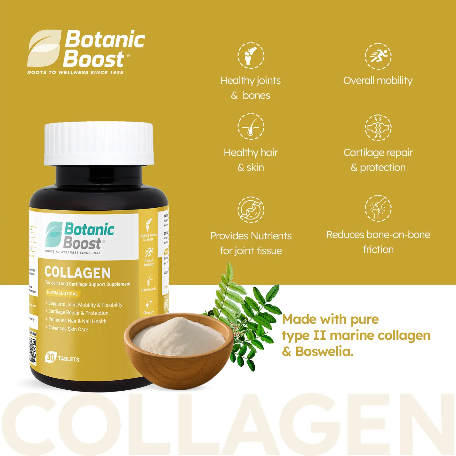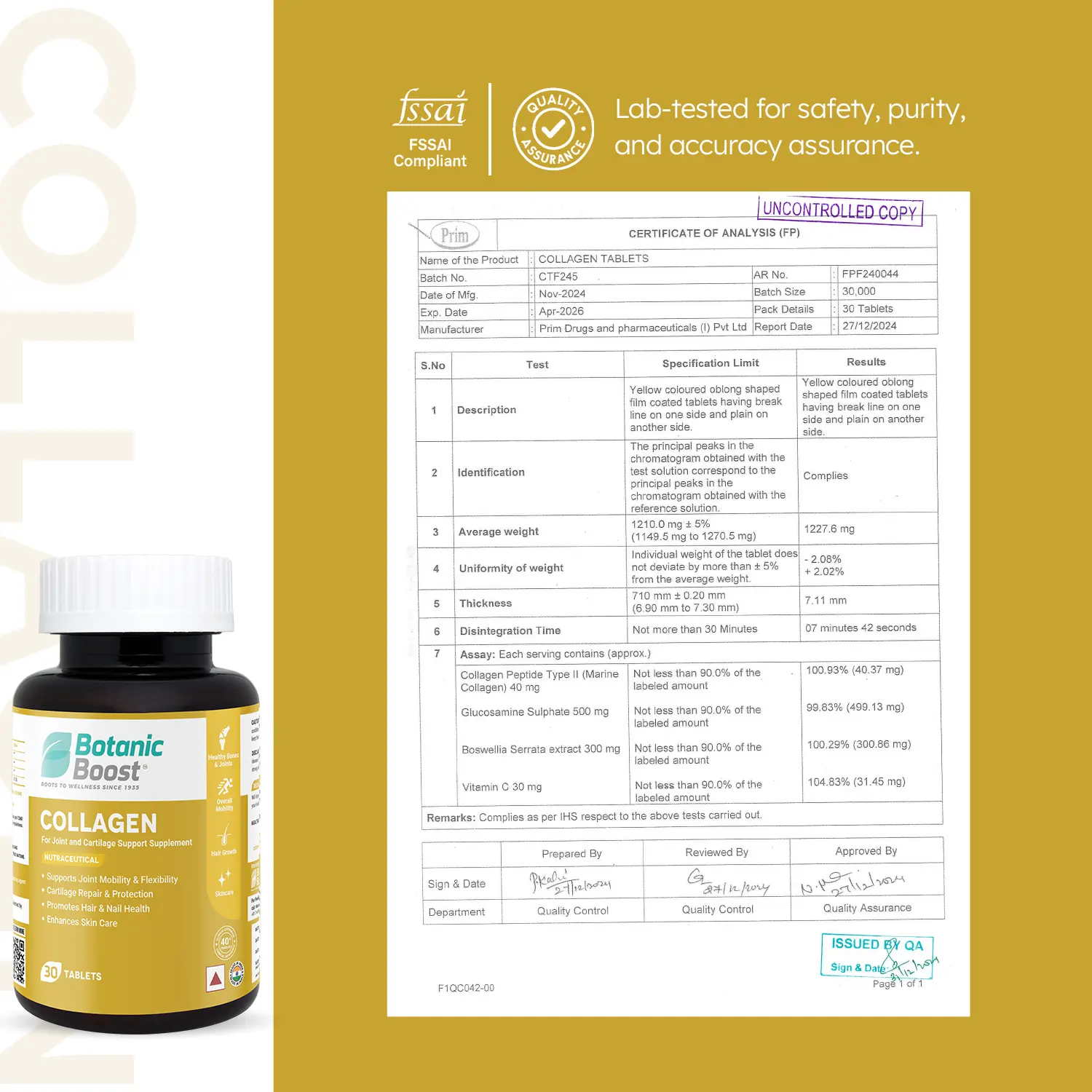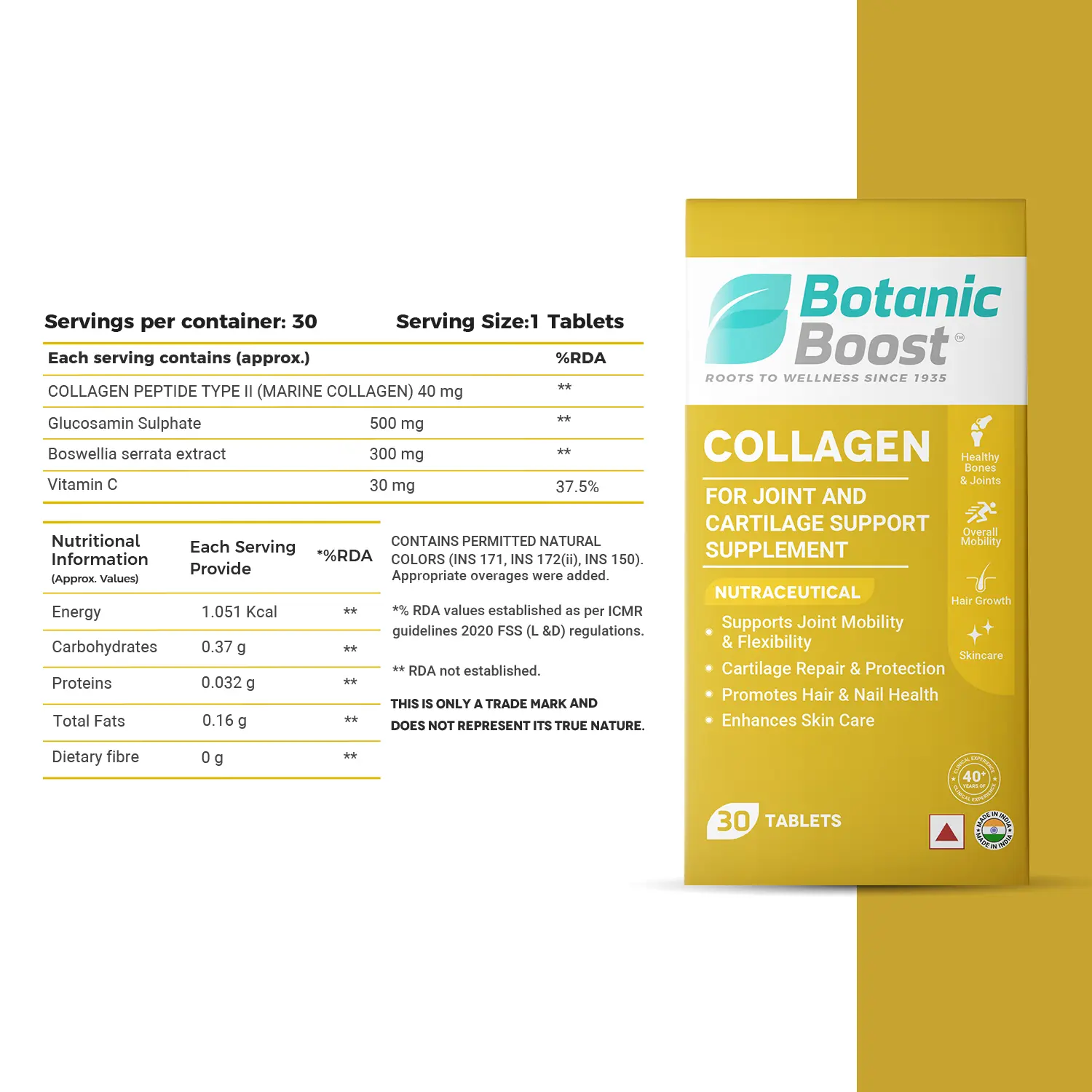 Undenatured type II Marine COLLAGEN 40mg, Glucosamine Sulphate 500mg, Boswellia serrata extract 300 mg and Vitamin C 30 mg